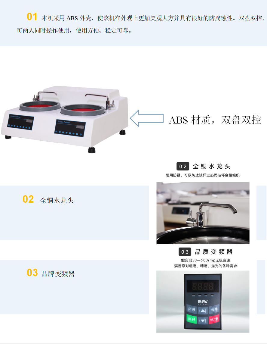 本機(jī)帶有冷卻裝置,可以在研磨拋光時(shí)對(duì)試樣進(jìn)行冷卻,以防止因試樣過熱而破壞金相組織。該機(jī)使用方便、安全可靠,是工廠、科研單位以及大專院校實(shí)驗(yàn)室的理想制樣設(shè)備。