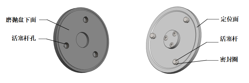 01 磨拋盤可快速更換,兩手拿住磨拋盤輕輕上提即可取下來(lái);將另一個(gè)磨拋盤兩手拿平,目測(cè)磨拋盤的三個(gè)活塞桿孔與三個(gè)活塞桿基本對(duì)應(yīng)時(shí)落下,感覺(jué)其中一個(gè)孔對(duì)應(yīng)時(shí),輕微擺動(dòng)磨拋盤使另兩個(gè)也對(duì)應(yīng)后將盤持平插入,再用手控壓一下,使磨拋盤下面與磨拋?zhàn)亩ㄎ幻嫱耆佑|。