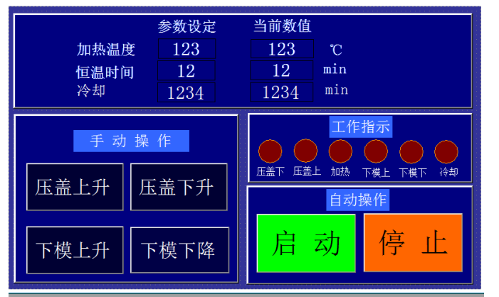 3、系統(tǒng)進(jìn)入自動(dòng)工作狀態(tài),此時(shí)壓蓋下,下模上,加熱指示燈亮。設(shè)備進(jìn)行自動(dòng)加壓,加熱。