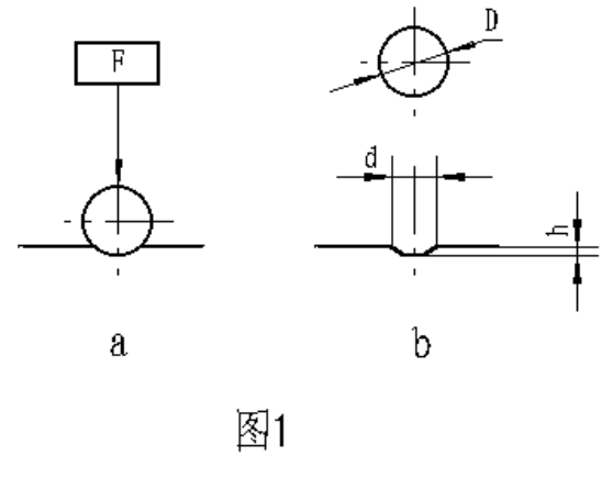 金屬布氏硬度試驗(yàn)系采用一定直徑硬質(zhì)合金球,以規(guī)定試驗(yàn)力壓入被測材料表面(圖1a)按規(guī)定保持時(shí)間后,卸除試驗(yàn)力,(圖1b)測量試樣表面的壓痕直徑,以計(jì)算出布氏硬度,并以下式計(jì)算之: